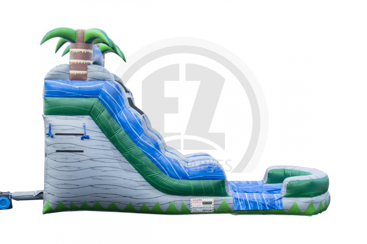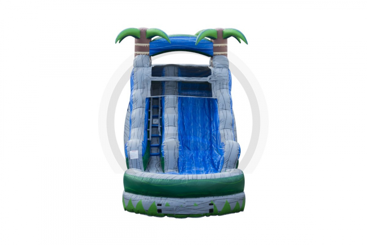 Imagine a tropical getaway in your own backyard with the 15' Cascade Palms Water Slide. Dive from a towering 15 feet, splashing down into a refreshing pool at the bottom. This inflatable water slide combines the thrill of a water park with the lush vibes of a palm-tree-lined oasis. Perfect for sunny days, it promises hours of fun and cool relief for all ages. Slide platform sits 8.5' high.