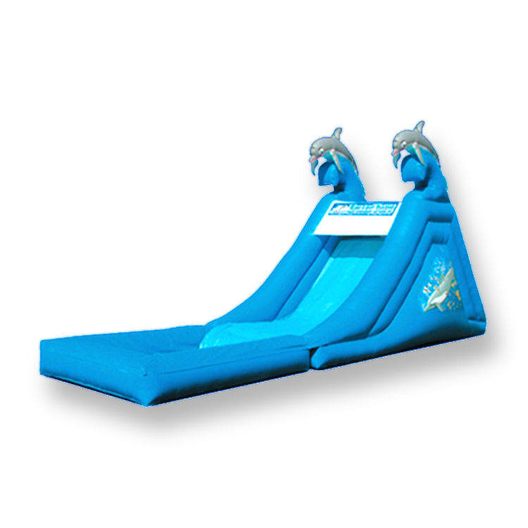 This unique unit can be used with or without water. A great way to stay cool in the summer and have a blast any other time of the year! Overall height to the top of the dolphins in 15', slide platform sits at 7'. This slide does not have an attached misting system, so you can put a sprinkler on it, or simply fill the pool and let the fun begin!